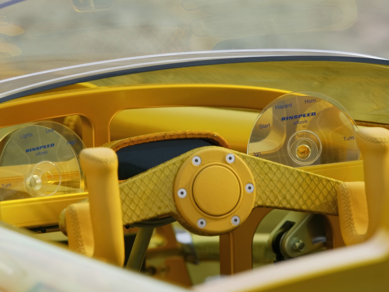 The eXasis is a real eye-catcher with nothing to hide. The outer Makrolon shell, moulded by the Swiss firm Mecaplex and coated with a tinge of yellow by the German hard coatings specialist, KRD, reveals the vehicle’s load-bearing aluminium chassis. The chassis looks as if it has been cut from a solid piece of material, and in fact the bulkheads are. Despite this, the entire construction exudes a sense of lightness like bamboo, underlined by a Lesonal chrome effect finish based on Bayer MaterialScience’s Desmodur and Desmophen. To finish the surfaces of the knobs and levers, the Bayer experts came up with a special soft-feel coating based on waterborne binders – their sole aim being to pamper the eyes and hands of the driver.